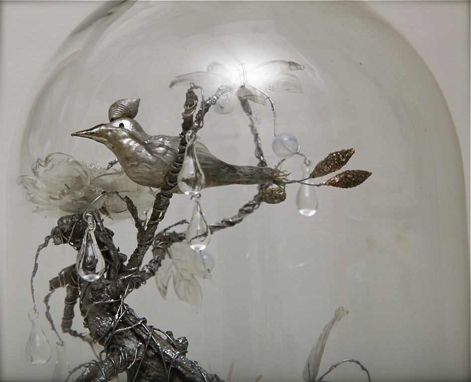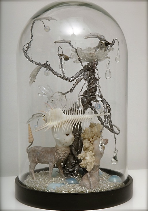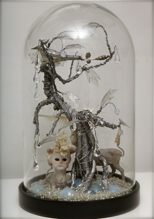 It is made with vintage toys, antique doll heads, shells, glass flower parts, old christmas ornaments, and a bonsai tree I killed……this version is much easier to take care of……