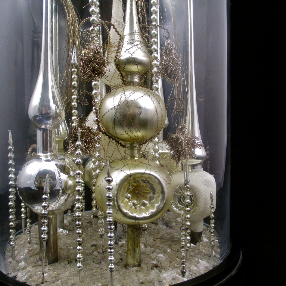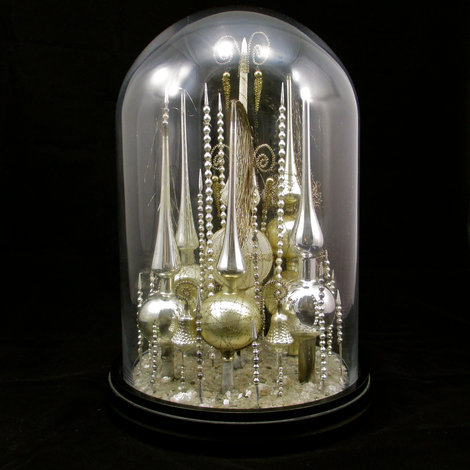 I had collected a few vintage tree toppers in gold and silver and liked how they looked as a group. I wanted to find a way to safely and dramatically display them. A glass dome proved to be the perfect solution!