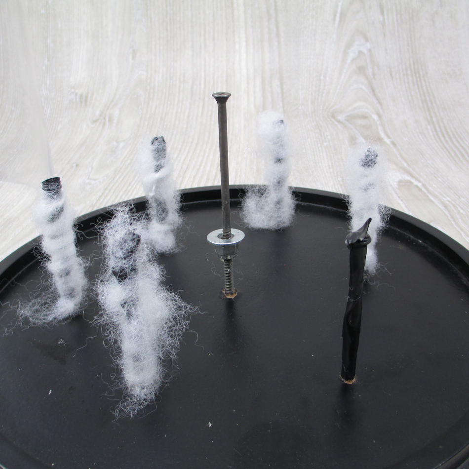 I began by putting a screw to hold each topper into the wood base. (You can look at the picture below to see how I created a “radial” design.) My large tree toppers were almost all the same height, and I decided I wanted to make the center one taller for a better composition. I glued a washer and nut to a long screw to create a raised “platform” for that one. Each standing screw was then wrapped in tape and some fiberfil to protect the glass toppers and help hold them securely. I then drilled small holes in the spaces between the screws to hold the thin, glass “spikes”. (I left the sawdust in the photos so you could easily see the pattern I used.) I placed the tree toppers before the spikes and used a small piece of tape or dab of hot glue to hold things straight. I finished the display by sprinkling large mica flakes on the base.