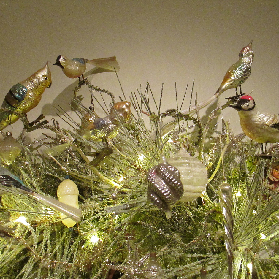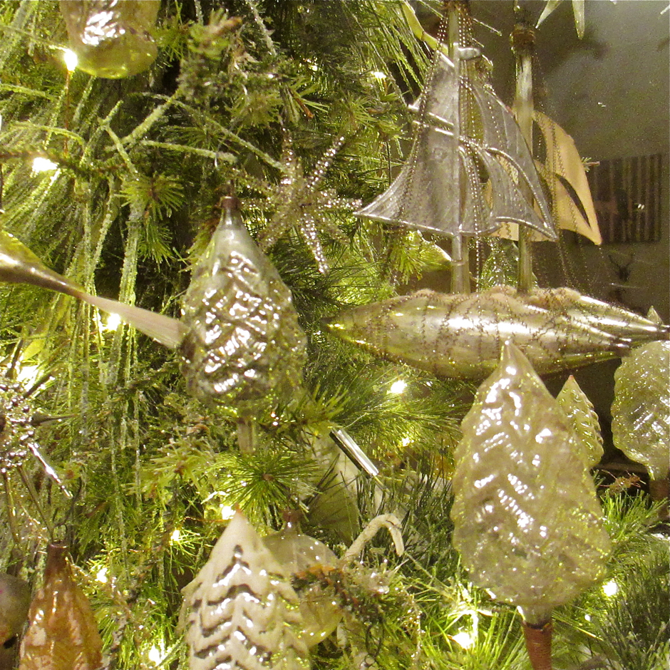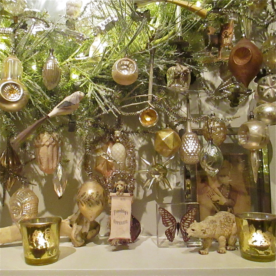 Most of the ornaments are probably 1920’s and 30’s, but they do span the years from about 1890 to the 1950’s. I focus on gold, silver, white and faded ornaments. (It keeps me from collecting everything!) I made the wreath from a wiry base wreath and added grey wood branches and long-needled sprays. I covered the whole thing in mica flakes for softness and sparkle. This year I added small LED wire lights.