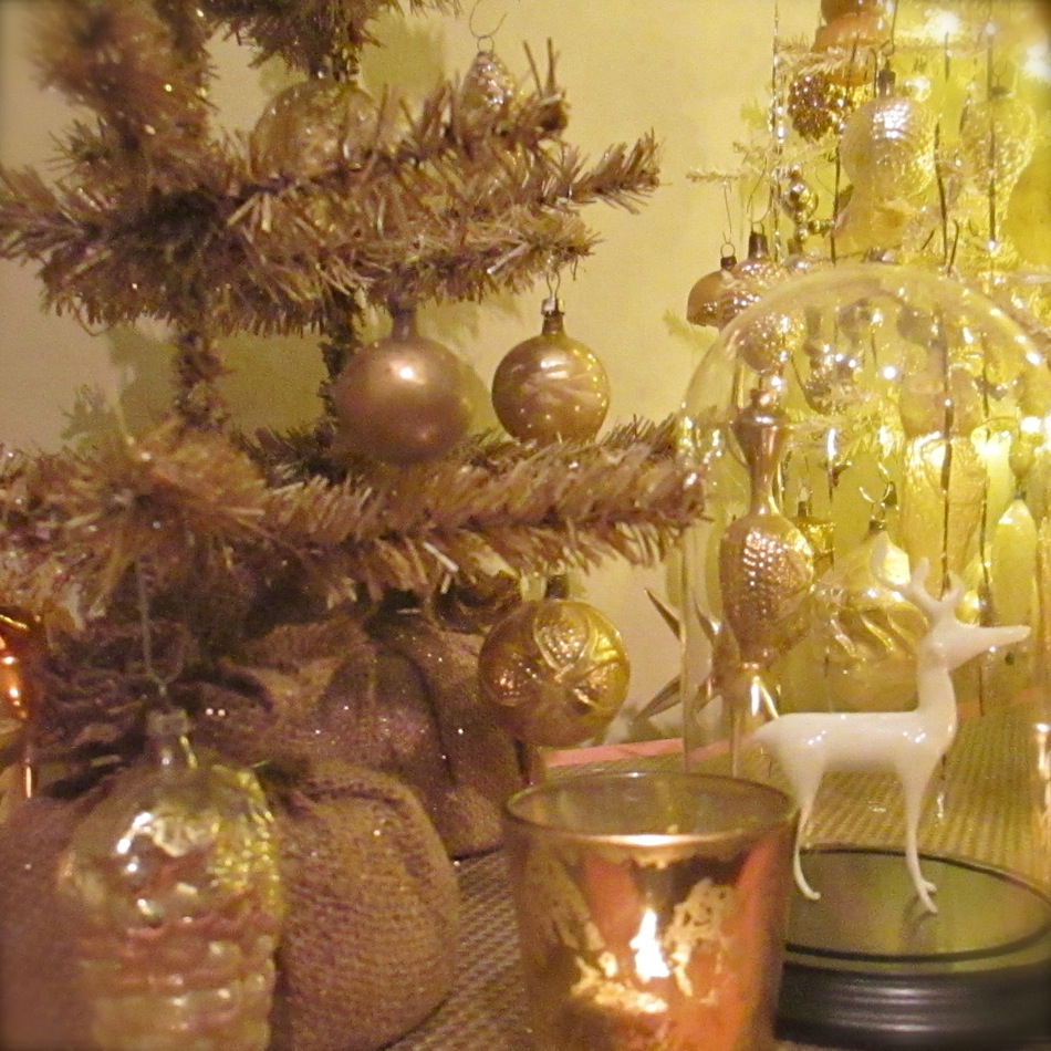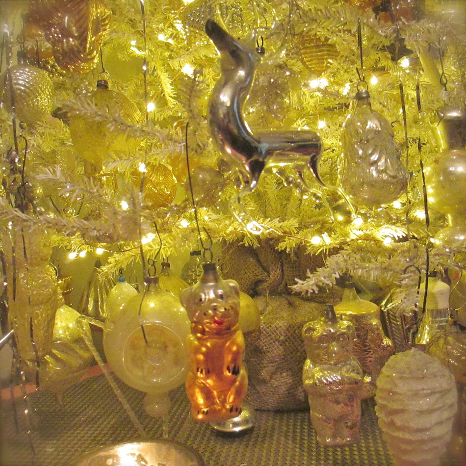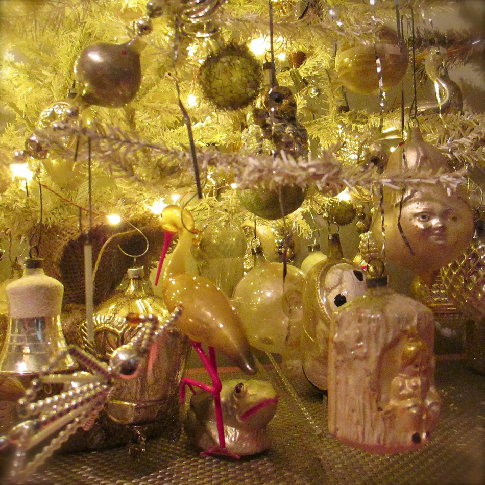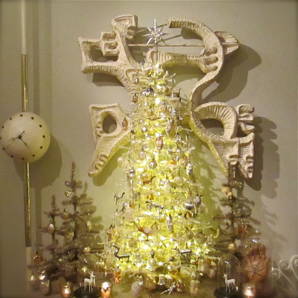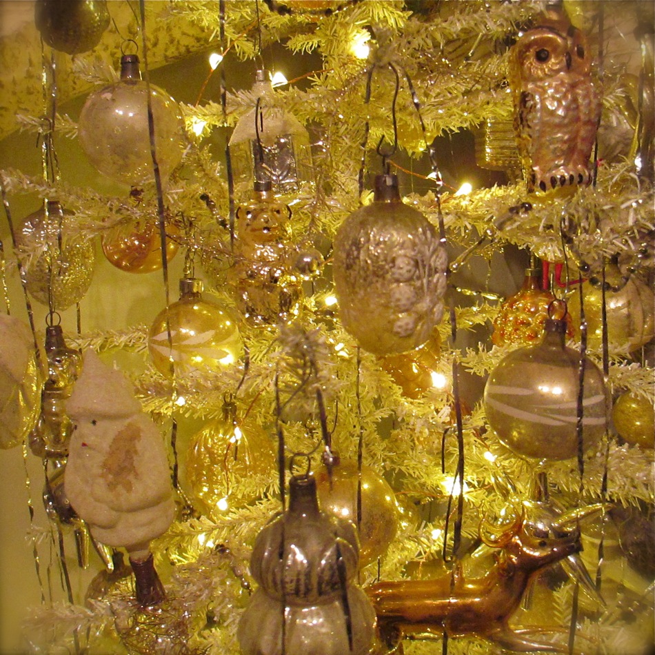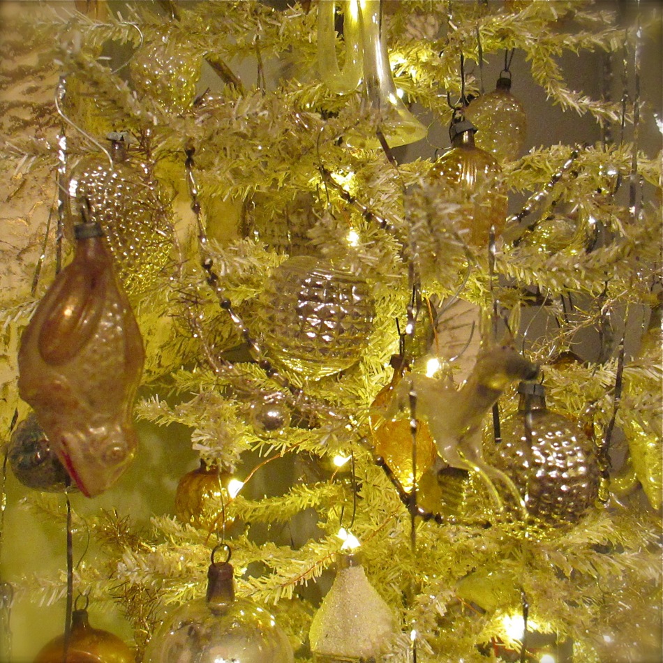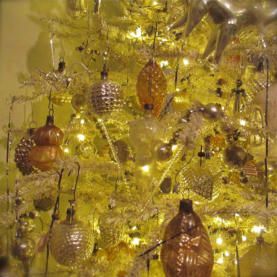 Presented for your viewing pleasure is my “antiquey” tree. I originally found a very tall and narrow white tree and thinned out the branches a bit before covering it in mica. I recently added the inexpensive gold trees on the sides for ornament overflow. I am always rearranging, fixing, or finding ornaments and it is nice to have a place ready to go to hang them. The large tree can be tricky to navigate as it is quite full and covered in tinsel. As you can see, this grouping continues my simple color palette of white, gold, silver, clear, and “faded”…