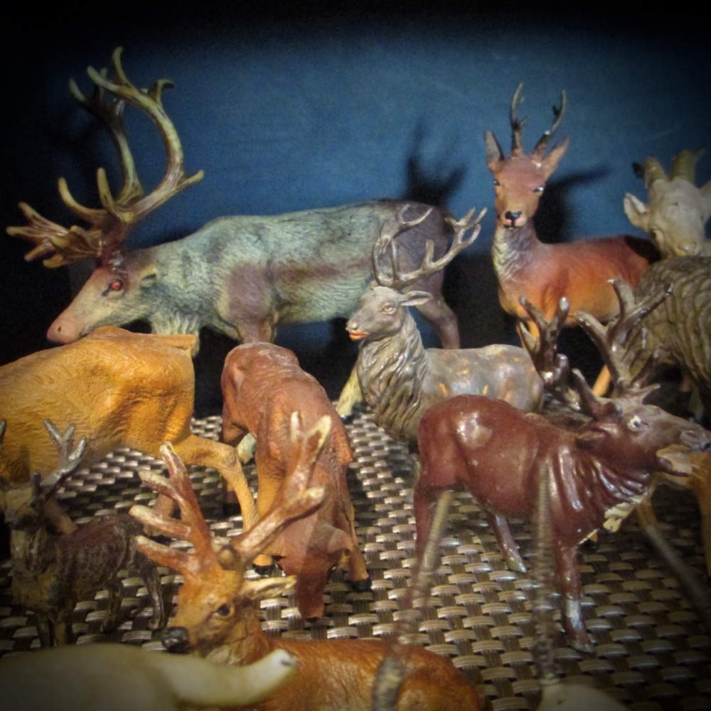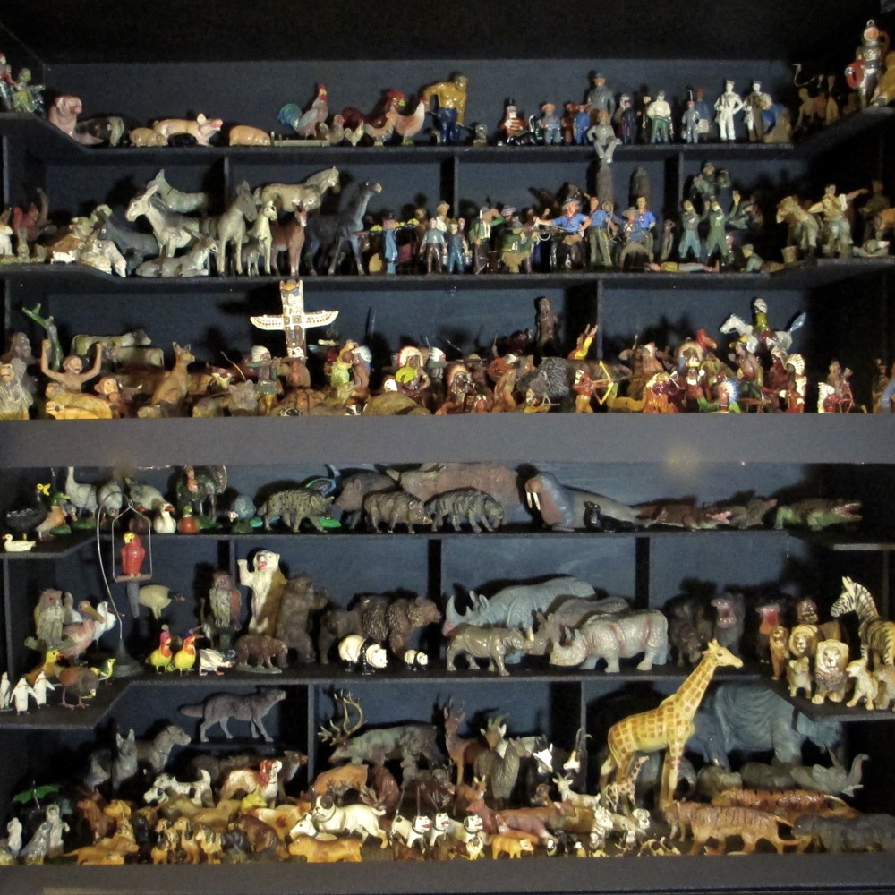 I gave myself six months to get settled in after my move, but it may take a little longer…. I have recently unpacked and gathered together most of my little vintage and antique toys/figures into one cabinet. They aren’t entirely set up, but the cabinet is coming together. There are lots of animals and figures in a constantly changing collection. They span several decades and are in a range of conditions. Some will eventually end up in my quirky projects.