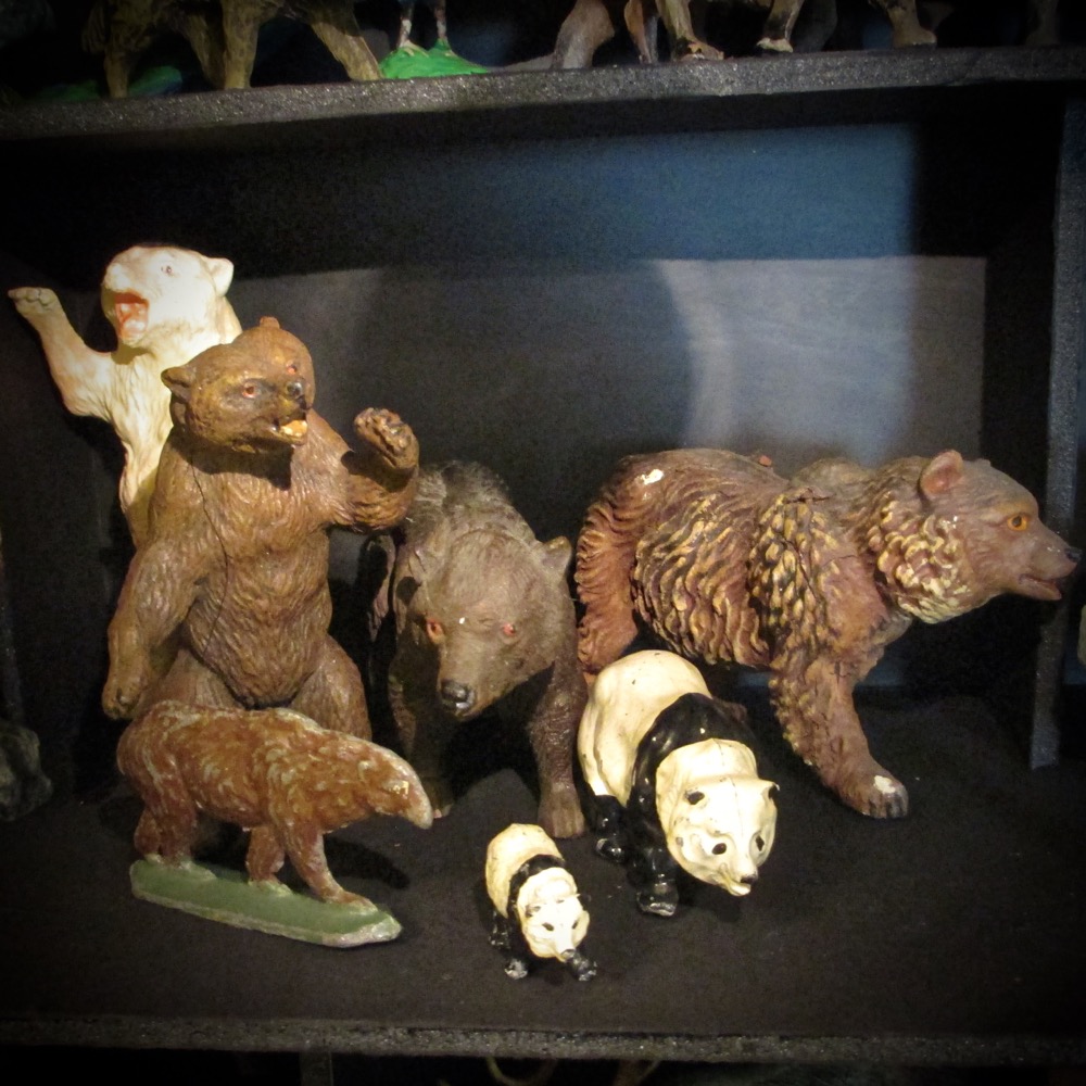 My favorite little friends are probably the vintage composition animals from the 30’s to 50’s but I also have lead, chalkware, wood, porcelain, cotton, and some plastic (although most of my celluloid is a little out of scale so it is on a different shelf.)  Most were intended as toys, but there are also decorative figures, cake or holiday decorations, advertising pieces and random other things. I keep them grouped by subject for easy reference, but occasionally they like to escape their expected location for displays or photo ops….
